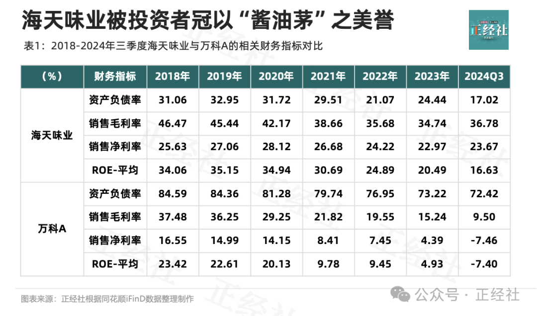 比较来看(表1),海天味业钞票欠债率一直不高,且连年裁减直至17.02%,万科A则终年被债务困扰。万科A的销售净利润率、ROE从2018年的23.42%一起下滑,至2024年三季度已跌至负值-7.4%。海天味业同期内的销售净利率稳如老狗,ROE也终年稳坐20%的水准。