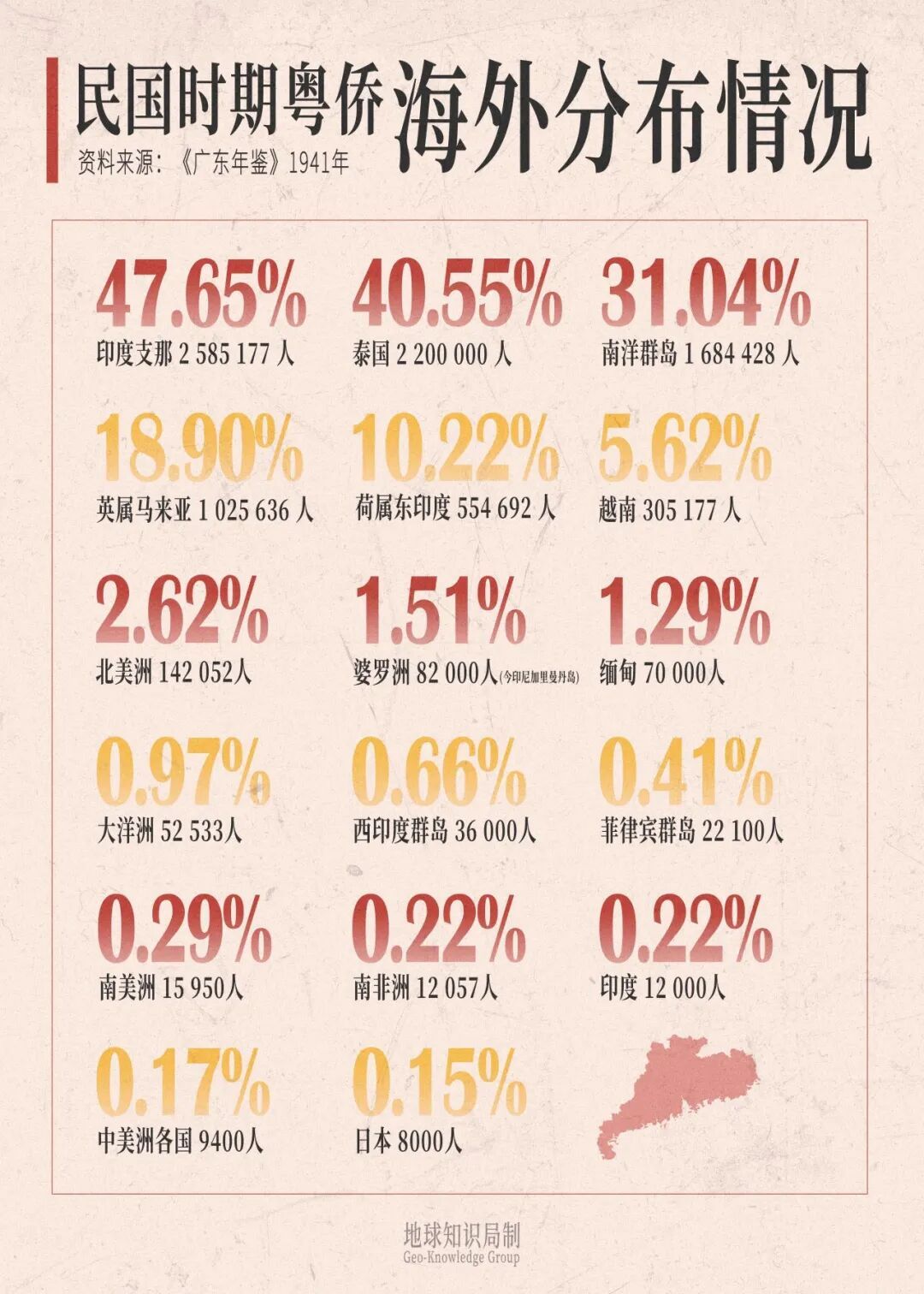 至民国时期,广东也曾成为了华裔东说念主数最多的地区,粤侨在宇宙华裔中占比超过一半。而他们的指标地,大多是印度支那、泰国、南洋群岛等地。